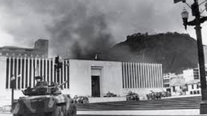 Miércoles 6 de noviembre, 11:30 a. m. aprox.: cerca de 35 guerrilleros del M-19 irrumpen armados en el Palacio de Justicia, toman como rehenes a magistrados, funcionarios, abogados y visitantes. La respuesta: la Policía y el Ejército rodean el edificio y se inicia la “retoma” que se prolonga por 28 horas, con empleo de tanques y fuego pesado en el centro de Bogotá. Jueves 7: al amanecer continúa el asalto final; hacia el mediodía las fuerzas estatales dan por “recuperado” el Palacio. El saldo: más de 100 personas fallecidas, incluidos 11 magistrados de la Corte Suprema.