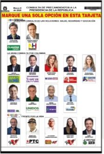 En el segundo puesto del tarjeton aparece la Gran Consulta por Colombia, que agrupa a nueve precandidatos del sector de derecha:
