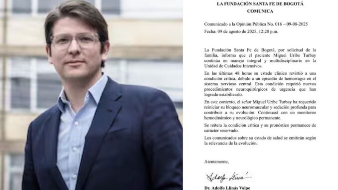 Bogotá, 9 de agosto de 2025 — La Fundación Santa Fe de Bogotá emitió este sábado al mediodía un nuevo comunicado oficial sobre el estado de salud del senador Miguel Uribe Turbay, quien permanece hospitalizado en la Unidad de Cuidados Intensivos (UCI) tras una recaída crítica en las últimas 48 horas.