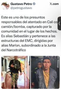 Presidente Gustavo Petro publicó dos fotografías de uno de los capturados: «Este es uno de los presuntos responsables del atentado en Cali con camión/bomba, capturado por la comunidad en el lugar de los hechos. Es alias Sebastián y pertenece a las estructuras del EMC, dirigidas por alias Marlon, subordinado a la Junta del Narcotráfico»
