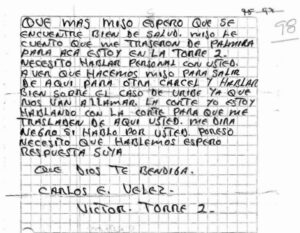 Esta son dos de las cartas a las que hace referencia el testigo alias ‘Jopra’, exjefe de seguridad de Pablo Hernán Sierra, en las que Vélez le pide hablar sobre el caso del expresidente Uribe. ‘Jopra’ ha dicho que Vélez le insistía en mentir sobre el expresidente.