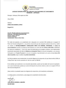 “Me permito comunicarle que este despacho judicial el día de hoy, remitió con destino al ESTABLECIMIENTO CARCELARIO INPEC DE SONSÓN, ANTIOQUIA, la boleta de encarcelamiento suscrita por el titular de este despacho en contra del señor Álvaro Uribe Vélez (…), quien fue sentenciado por el juzgado comitente”, se lee en el oficio del Juzgado