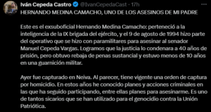 El senador Iván Cepeda Castro, hijo del exsenador asesinado, reaccionó tras conocerse la captura. “Hernando Medina Camacho fue parte de la Fuerza Pública y actuó en contubernio con estructuras contrainsurgentes responsables de graves violaciones a los derechos humanos en los años 90 y 2000. Su captura es un acto de justicia, aunque tardío”, expresó.
