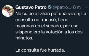 Respecto a las acusaciones de «traición» por el resultado de la consulta popular en el Congreso, reitero que no soy congresista ni tengo voto en el Senado. El Congreso, en su autonomía, priorizó la reforma laboral, una lucha que no es solo suya, señor Presidente, sino también mía como líder política con décadas de trabajo por los derechos laborales y sociales. En la democracia, estas causas no son patrimonio de una sola tendencia política, sino que se construyen con el aporte de todos. El Partido de la U, por ejemplo, presentó una ponencia mejorada para fortalecer esta reforma. La decisión de no avanzar con la consulta popular responde a la lógica de un trámite legislativo revivido, pero no es de mi competencia.