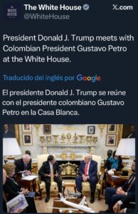 La Casa Blanca publicó dos fotografiías de la reunión: «El presidente Donald J. Trump se reúne con el presidente colombiano Gustavo Petro en la Casa Blanca»