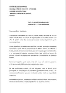 «Para que tenga efecto la renuncia a la prescripción, primero se debe decretar la prescripción por parte del Tribunal Superior de Bogotá, en caso de que se vayan a extender de esa fecha. Después, entrarían a estudiar la renuncia a dicha prescripción».