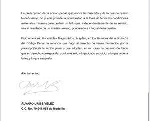 Bogotá, 25 de agosto de 2025 – En una decisión que ha sorprendido a la opinión pública, el expresidente Álvaro Uribe Vélez comunicó formalmente al Tribunal Superior de Bogotá su renuncia a la prescripción de la acción penal en el proceso judicial que enfrenta. Esta medida implica que Uribe no se acogerá al beneficio legal que extingue la acción penal por el paso del tiempo, a pesar de que su caso prescribirá el próximo 16 de octubre.
