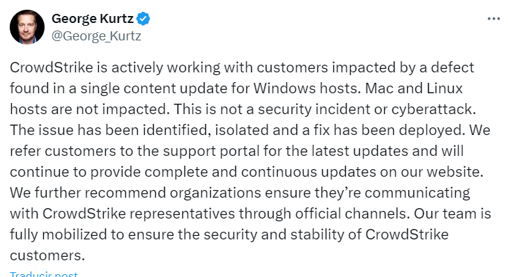 George Kurtz fundador y dueño de  CrowdStrike dijo en entrevista a USA To Day que fue