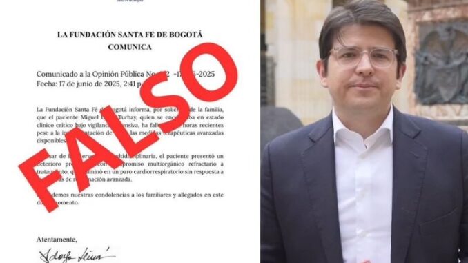 La Fundación Santa Fe de Bogotá, que confirmó que el senador se encuentra vivo y luchando por su vida. Según el último parte médico emitido a las 7:10 a.m. del 17 de junio, Uribe Turbay continúa en la Unidad de Cuidados Intensivos con “condición clínica de máxima gravedad y pronóstico reservado”.