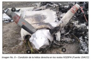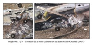 Respecto a la hélice izquierda, los investigadores encontraron que esta “se encontró desprendida del flanche del motor izquierdo, posicionada debajo de la estructura del ala izquierda” y que “presentaba afectación por hollín y fuego en un 45%”. El informe agrega que el spinner y las cuatro palas estaban instaladas, aunque “las palas identificadas como 3 y 4 presentaban afectación por el fuego”. Asimismo, se determinó que “las palas 1 y 4 no presentaban deformación significativa”, mientras que “las palas 2 y 3 presentaban ligera deformación… con características de impacto con baja energía”, un dato considerado clave para evaluar el nivel de potencia al momento del choque.