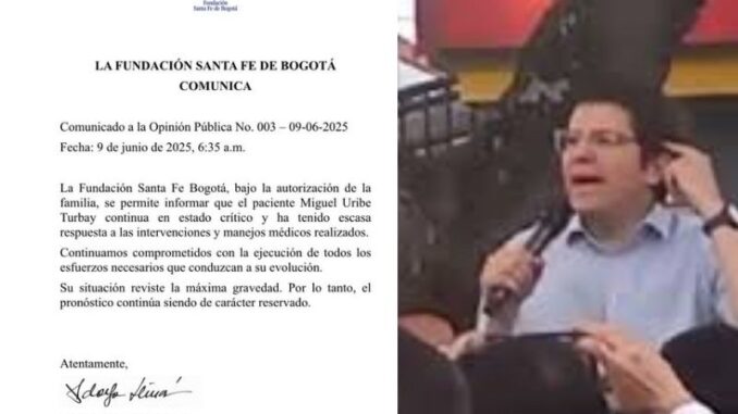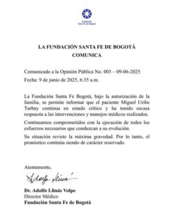 La Fundación Santa Fe Bogotá, bajo la autorización de la familia, se permite informar que el paciente Miguel Uribe Turbay continua en estado crítico y ha tenido escasa respuesta a las intervenciones y manejos médicos realizados.