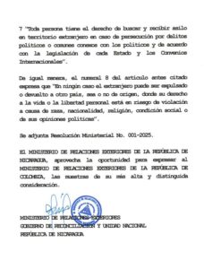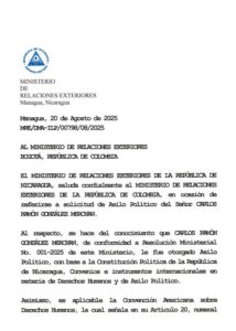 “Carlos Ramón González Merchán, de conformidad con la resolución 001-2025 de este ministerio, le fue otorgado asilo político con base en la Constitución política de la República de Nicaragua, convenios e instrumentos internacionales en materia de derechos humanos”, señala el documento oficial.