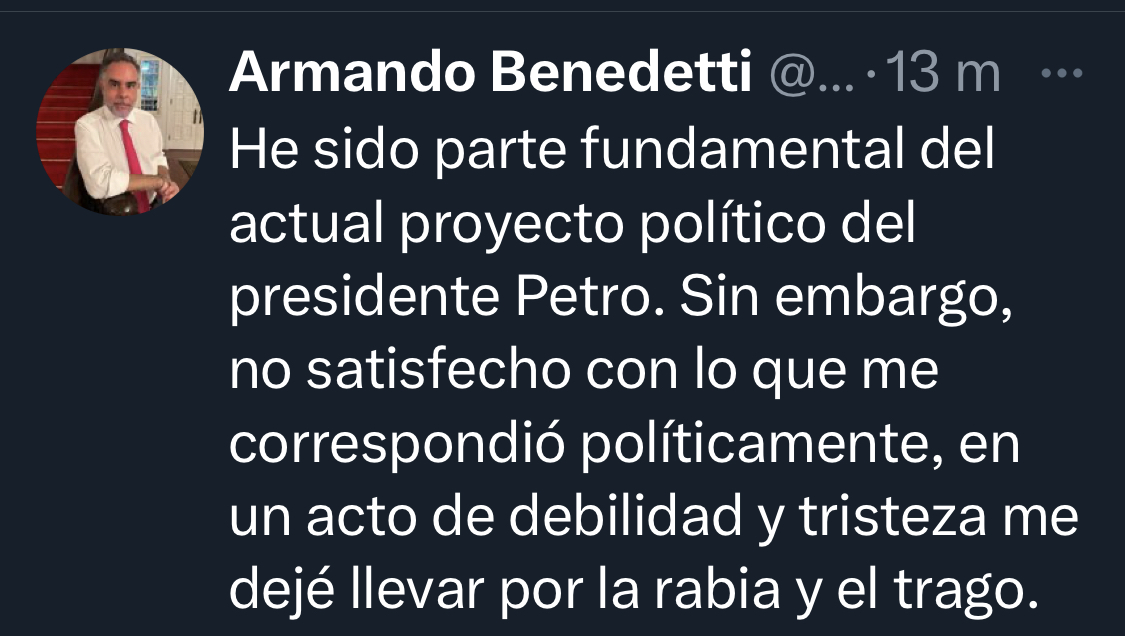 “He sido parte fundamental del actual proyecto político del presidente Petro. Sin embargo, no satisfecho con lo que me correspondió políticamente, en un acto de debilidad y tristeza me dejé llevar por la rabia y el trago”: Armando Benedetti