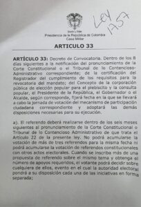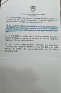 “Para quienes afirman desde la prensa que el presidente no puede decretar la consulta popular, si el senado no se pronuncia sobre el concepto previo favorable o no, remito la ley que me faculta. Ley 1757. Literal c, artículo 33.